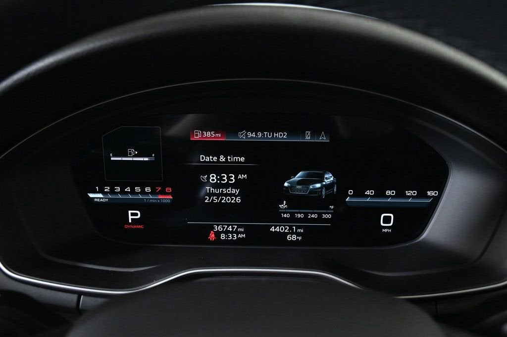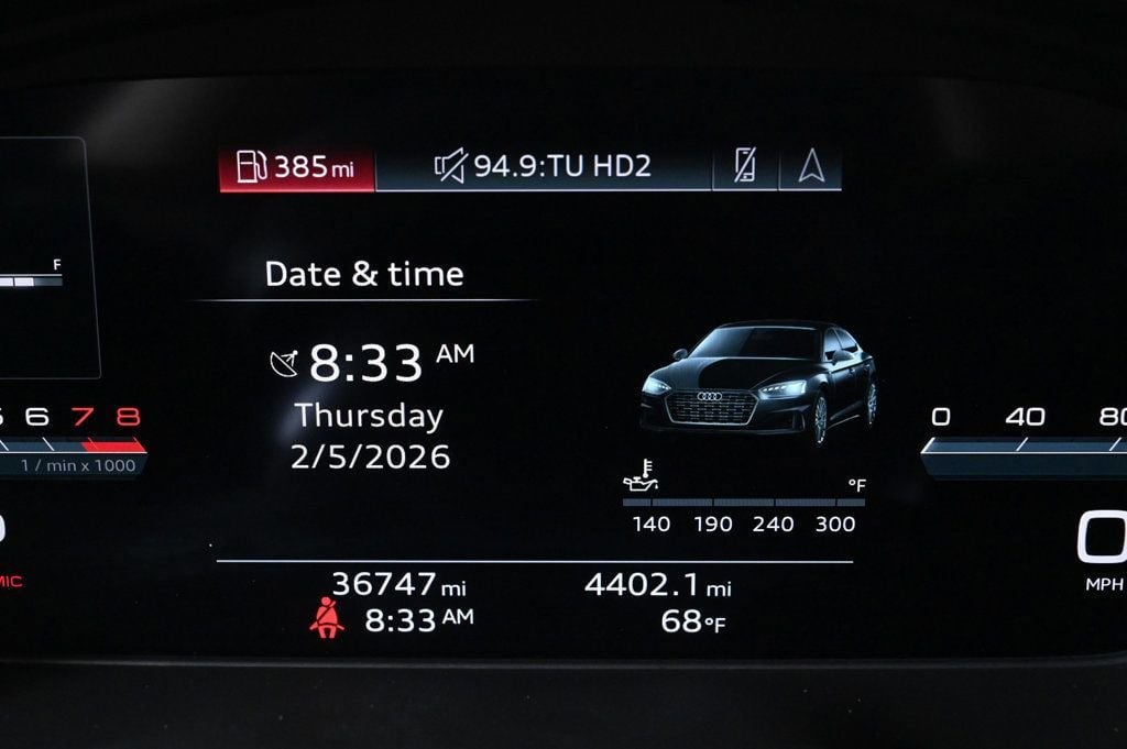 KEY FEATURES AND OPTIONS Comes equipped with: Air Conditioning, Rear Air Conditioning, Sunroof, Front Heated Seats. This Audi A5 Sportback also includes Power Driver's Seat, Clock, Climate Control, Power Passenger Seat, Tachometer, Multi-Zone Climate Control, Memory Seat Position, Digital Info Center, Cruise Control, Homelink System, Tilt Steering Wheel, Power Steering, Telescoping Steering Wheel, Power Windows, Steering Radio Controls, Wood Trim, Power Mirrors, Moonroof, Leather Steering Wheel, Leather Shifter, Driver Airbag, ABS Brakes, Fog Lights, Passenger Airbag, Traction Control, Intermittent Wipers, Side Airbags, Dynamic Stability, Keyless Entry, Rear Defogger, Security System, AM/FM, Anti-Theft, Sliding Rear Window, Sport Seats, Center Arm Rest, Remote Trunk Lid, Vanity Mirrors, Heated Mirrors, Child Proof Door Locks, Daytime Running Lights, Parking Sensors, Side Curtain Airbags, Roll Stability Control, Power Lift Gate, Tire Pressure Monitor, Carpeted Floor Mats, Overhead Console, Voice Control. Air Conditioning, Climate Control, Dual Zone Climate Control, Cruise Control, Power Steering, Power Windows, Power Mirrors, Leather Steering Wheel, Leather Shifter, Power Drivers Seat, Power Passenger Seat, Memory Seat Position, Rear Air Conditioning, Wood Trim, Clock, Tachometer, Digital Info Center, Homelink System, Tilt Steering Wheel, Telescoping Steering Wheel, Steering Wheel Radio Controls, Sunroof, Moonroof, Driver Airbag, Passenger Airbag, Side Airbags, Keyless Entry, Security System, ABS Brakes, Traction Control, Dynamic Stability, Rear Defogger, Fog Lights, Intermittent Wipers, AM/FM, Anti-Theft, Alloy Wheels, Sport Package, Leather Interior Surface, 10 Speakers, Radio data system, Radio: Audi Sound System, Automatic temperature control, Power driver seat, Four wheel independent suspension, 4-Wheel Disc Brakes, Anti-whiplash front head restraints, Dual front impact airbags, Dual front side impact airbags, Emergency communication system: Audi connect CARE, Front anti-roll bar, Knee airbag, Low tire pressure warning, Occupant sensing airbag, Overhead airbag, Power adjustable front head restraints, Rear anti-roll bar, Power Liftgate, Brake assist, Exterior Parking Camera Rear, Auto High-beam Headlights, Delay-off headlights, Bumpers: body-color, Heated door mirrors, Power door mirrors, Turn signal indicator mirrors, Auto-dimming Rear-View mirror, Compass, Driver door bin, Driver vanity mirror, Front reading lights, Genuine wood console insert, Genuine wood dashboard insert, Genuine wood door panel insert, Heated steering wheel, Illuminated entry, Outside temperature display, Overhead console, Passenger vanity mirror, Rear reading lights, Rear seat center armrest, Telescoping steering wheel, Front Center Armrest, Heated front seats, Heated Front Sport Seats, Leather Seating Surfaces, Split folding rear seat, Sport Plus Seats, Passenger door bin, Wheels: 18 5-Double-Spoke Design, Rain sensing wipers Carpeted Floor Mats, Center Arm Rest, Child Proof Door Locks, Daytime Running Lights, Front Heated Seats, Heated Mirrors, Overhead Console, Parking Sensors, Power Lift Gate, Remote Trunk Lid, Roll Stability Control, Side Curtain Airbags, Sliding Rear Window, Sport Seats, Tire Pressure Monitor, Vanity Mirrors - Contact Alvaro Uribe at 786-628-7606 or auribe@ferrariofmiami.com for more information. -