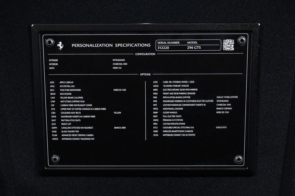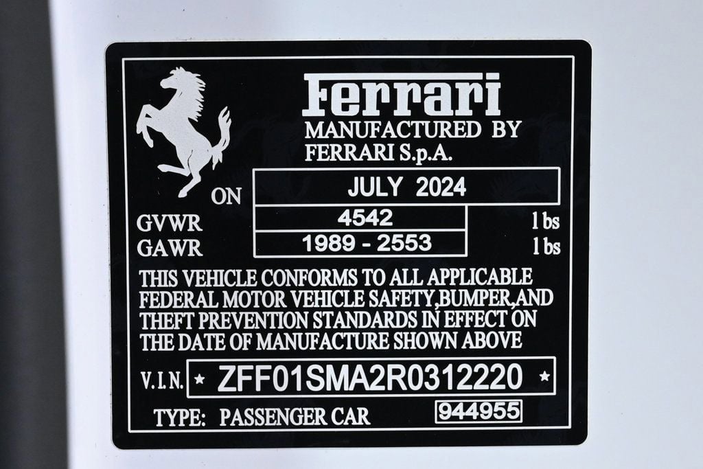 This 2024 Ferrari 296 GTS is located at The Collection at 200 Bird Rd, Coral Gables, FL 33146. Please contact our sales team at 786-628-7602, for more information. The Collection Is Not Responsible for Typographical Errors. BUY WITH CONFIDENCE! CARFAX 1-Owner 296 GTS and CARFAX Buyback Guarantee qualified! FERRARI CERTIFIED PRE-OWNED This Certified Ferrari includes a 101 point inspection, 24/7 roadside assistance, a warranty of: 12-Month Service Contract, TitleGuard Insurance against odometer fraud, title defects or unreported DMV brands VERY LOW MILES! At just 579 miles, this 2024 Ferrari provides great value. LOADED WITH VALUE! Comes equipped with: Air Conditioning, Navigation System. This Ferrari 296 GTS also includes Clock, Climate Control, Power Passenger Seat, Tachometer, Memory Seat Position, Digital Info Center, Cruise Control, Tilt Steering Wheel, Power Steering, Telescoping Steering Wheel, Power Windows, Steering Radio Controls, Power Mirrors, Leather Steering Wheel, Leather Shifter, Driver Airbag, ABS Brakes, Fog Lights, Passenger Airbag, Traction Control, Intermittent Wipers, Side Airbags, Dynamic Stability, Keyless Entry, Rear Defogger, Security System, AM/FM, Satellite Radio, Rear Spoiler, Center Arm Rest, Cup Holders, Remote Fuel Door, Remote Trunk Lid, Heated Mirrors, Rear Fog Lamps, Daytime Running Lights, Parking Sensors, Reverse Camera, Roll Stability Control, Adaptive headlights, Tire Pressure Monitor, Premium Sound, Carpeted Floor Mats, HD Radio, Onboard Hard Drive, Voice Control. Air Conditioning, Climate Control, Cruise Control, Power Steering, Power Windows, Power Mirrors, Leather Steering Wheel, Leather Shifter, Power Passenger Seat, Memory Seat Position, Clock, Tachometer, Digital Info Center, Tilt Steering Wheel, Telescoping Steering Wheel, Steering Wheel Radio Controls, Driver Airbag, Passenger Airbag, Side Airbags, Keyless Entry, Security System, ABS Brakes, Traction Control, Dynamic Stability, Rear Defogger, Fog Lights, Intermittent Wipers, AM/FM, Alloy Wheels, Leather Interior Surface, , Convertible HardTop, 6 Speakers, Radio data system, Automatic temperature control, Power driver seat, Adaptive suspension, Four wheel independent suspension, 4-Wheel Disc Brakes, Ceramic disc brakes: front and rear, Dual front impact airbags, Dual front side impact airbags, Front anti-roll bar, Integrated roll-over protection, Low tire pressure warning, Passenger cancellable airbag, Rear anti-roll bar, Brake assist, Exterior Parking Camera Rear, Rear Parking Sensors, Delay-off headlights, Fully automatic headlights, Bumpers: body-color, Convertible roof wind blocker, Heated door mirrors, Power door mirrors, Spoiler, Apple CarPlay, Compass, Convertible roof lining, Driver door bin, Front reading lights, Illuminated entry, Outside temperature display, Power convertible roof, Sport steering wheel, Standard Seats, Telescoping steering wheel, Voltmeter, Front Center Armrest, Leather Seat Trim, Sport Plus Seats, Passenger door bin, Wheels: 20 x 9 Fr & 20 x 11 Rr, Glass rear window, Rain sensing wipers Adaptive headlights, Carpeted Floor Mats, Center Arm Rest, Cup Holders, Daytime Running Lights, Heated Mirrors, Navigation System, Parking Sensors, Premium Sound, Rear Fog Lamps, Rear Spoiler, Rear Spoiler, Remote Fuel Door, Remote Trunk Lid, Reverse Camera, Roll Stability Control, Tire Pressure Monitor - Contact Alvaro Uribe at 786-628-7606 or auribe@ferrariofmiami.com for more information. -