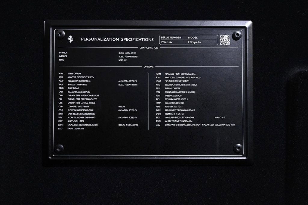 BUY WITH CONFIDENCE! CARFAX Buyback Guarantee qualified! EXTREMELY LOW MILES! Get the best value from your vehicle purchase. This 2023 boasts an extremely low 7858 miles! KEY FEATURES AND OPTIONS Comes equipped with: Air Conditioning, Navigation System. This Ferrari F8 Spider also includes Clock, Climate Control, Tachometer, Multi-Zone Climate Control, Digital Info Center, Cruise Control, Tilt Steering Wheel, Power Steering, Telescoping Steering Wheel, Power Windows, Power Mirrors, Leather Steering Wheel, Leather Shifter, Driver Airbag, ABS Brakes, Fog Lights, Passenger Airbag, Traction Control, Intermittent Wipers, Side Airbags, Dynamic Stability, Keyless Entry, Rear Defogger, Security System, AM/FM, Rear Spoiler, Cup Holders, Remote Fuel Door, Remote Trunk Lid, Heated Mirrors, Rear Fog Lamps, Daytime Running Lights, Parking Sensors, Reverse Camera, Roll Stability Control, Tire Pressure Monitor, Premium Sound, HD Radio, Onboard Hard Drive, Voice Control. Air Conditioning, Climate Control, Dual Zone Climate Control, Cruise Control, Power Steering, Power Windows, Power Mirrors, Leather Steering Wheel, Leather Shifter, Clock, Tachometer, Digital Info Center, Tilt Steering Wheel, Telescoping Steering Wheel, Driver Airbag, Passenger Airbag, Side Airbags, Keyless Entry, Security System, ABS Brakes, Traction Control, Dynamic Stability, Rear Defogger, Fog Lights, Intermittent Wipers, AM/FM, Alloy Wheels, Leather Interior Surface, , Convertible HardTop, 6 Speakers, Radio data system, Automatic temperature control, Adaptive suspension, Four wheel independent suspension, 4-Wheel Disc Brakes, Ceramic disc brakes: front and rear, Dual front impact airbags, Dual front side impact airbags, Front anti-roll bar, Integrated roll-over protection, Low tire pressure warning, Passenger cancellable airbag, Rear anti-roll bar, Brake assist, Exterior Parking Camera Rear, Rear Parking Sensors, Delay-off headlights, Fully automatic headlights, Bumpers: body-color, Convertible roof wind blocker, Heated door mirrors, Power door mirrors, Spoiler, Apple CarPlay, Compass, Convertible roof lining, Driver door bin, Front reading lights, Illuminated entry, Outside temperature display, Power convertible roof, Sport steering wheel, Standard Seats, Telescoping steering wheel, Voltmeter, Leather Seat Trim, Sport Plus Seats, Passenger door bin, Wheels: 20 Standard, Glass rear window, Rain sensing wipers Cup Holders, Daytime Running Lights, Heated Mirrors, Navigation System, Parking Sensors, Premium Sound, Rear Fog Lamps, Rear Spoiler, Rear Spoiler, Remote Fuel Door, Remote Trunk Lid, Reverse Camera, Roll Stability Control, Tire Pressure Monitor - Contact Alvaro Uribe at 786-628-7606 or auribe@ferrariofmiami.com for more information. -
