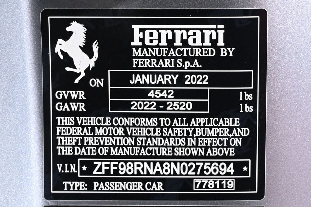 VERY LOW MILES! At just 6705 miles, this 2022 Ferrari provides great value. LOADED WITH VALUE! Comes equipped with: Air Conditioning, Navigation System, Front Heated Seats. This Ferrari Roma also includes Clock, Climate Control, Power Passenger Seat, Tachometer, Multi-Zone Climate Control, Memory Seat Position, Digital Info Center, Cruise Control, Tilt Steering Wheel, Power Steering, Telescoping Steering Wheel, Power Windows, Steering Radio Controls, Power Mirrors, Leather Steering Wheel, Driver Airbag, ABS Brakes, Fog Lights, Passenger Airbag, Traction Control, Intermittent Wipers, Side Airbags, Dynamic Stability, Keyless Entry, Rear Defogger, Security System, AM/FM, Rear Spoiler, Center Arm Rest, Cup Holders, Remote Fuel Door, Remote Trunk Lid, Heated Mirrors, Rear Fog Lamps, Daytime Running Lights, Roll Stability Control, Tire Pressure Monitor, Carpeted Floor Mats, Overhead Console, Voice Control. Air Conditioning, Climate Control, Dual Zone Climate Control, Cruise Control, Power Steering, Power Windows, Power Mirrors, Leather Steering Wheel, Power Passenger Seat, Memory Seat Position, Clock, Tachometer, Digital Info Center, Tilt Steering Wheel, Telescoping Steering Wheel, Steering Wheel Radio Controls, Driver Airbag, Passenger Airbag, Side Airbags, Keyless Entry, Security System, ABS Brakes, Traction Control, Dynamic Stability, Rear Defogger, Fog Lights, Intermittent Wipers, AM/FM, Alloy Wheels, Leather Interior Surface, , 7 Speakers, Radio data system, Automatic temperature control, Power driver seat, Four wheel independent suspension, 4-Wheel Disc Brakes, Ceramic disc brakes: front and rear, Dual front impact airbags, Dual front side impact airbags, Front anti-roll bar, Low tire pressure warning, Rear anti-roll bar, Delay-off headlights, Fully automatic headlights, Bumpers: body-color, Heated door mirrors, Power door mirrors, Spoiler, Apple CarPlay, Compass, Driver door bin, Front reading lights, Illuminated entry, Outside temperature display, Overhead console, Rear seat center armrest, Sport steering wheel, Standard Seats, Telescoping steering wheel, Front Center Armrest, Heated front seats, Leather Seat Trim, Sport Plus Seats, Passenger door bin, Wheels: 20 Standard, Rain sensing wipers Carpeted Floor Mats, Center Arm Rest, Cup Holders, Daytime Running Lights, Front Heated Seats, Heated Mirrors, Navigation System, Overhead Console, Rear Fog Lamps, Rear Spoiler, Rear Spoiler, Remote Fuel Door, Remote Trunk Lid, Roll Stability Control, Tire Pressure Monitor - Contact Alvaro Uribe at 786-628-7606 or auribe@ferrariofmiami.com for more information. -