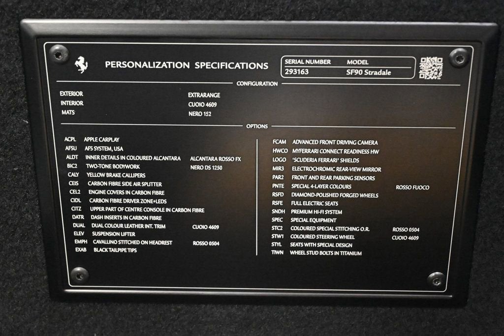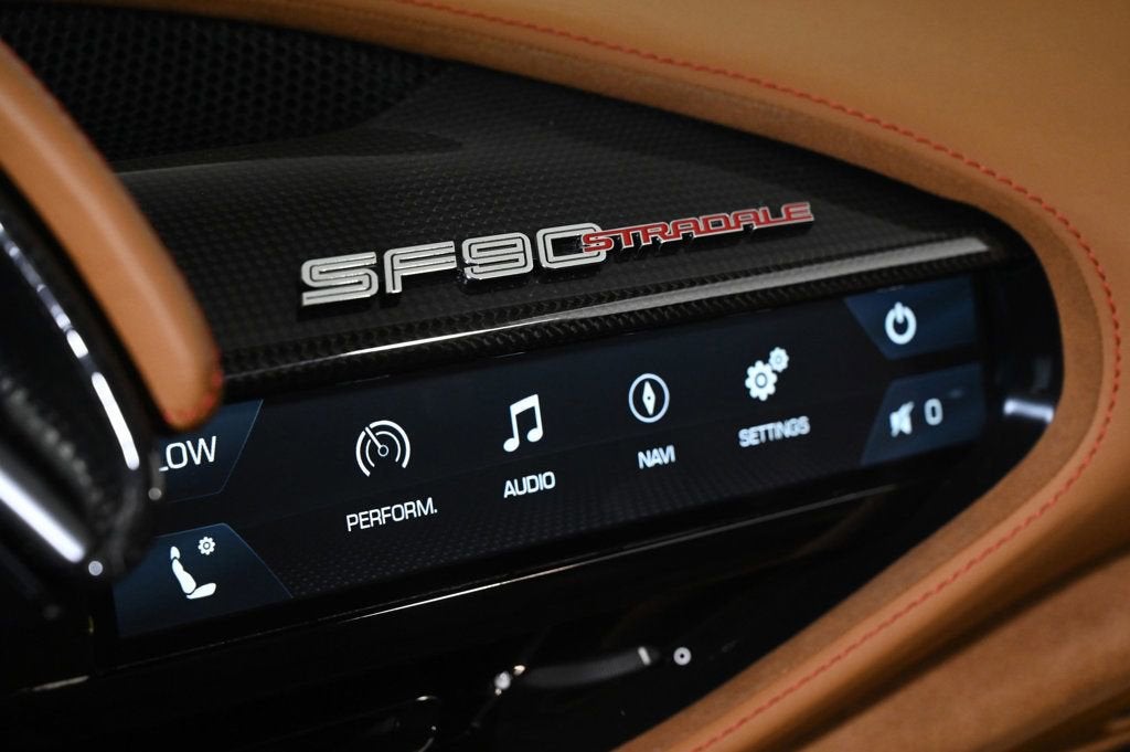 EXTREMELY LOW MILES! Get the best value from your vehicle purchase. This 2023 boasts an extremely low 392 miles! KEY FEATURES AND OPTIONS Comes equipped with: Air Conditioning, MP3, Navigation System. This Ferrari SF90 Stradale also includes Clock, Climate Control, Power Passenger Seat, Tachometer, Memory Seat Position, Digital Info Center, Cruise Control, Tilt Steering Wheel, Power Steering, Telescoping Steering Wheel, Power Windows, Steering Radio Controls, Power Mirrors, Leather Steering Wheel, Leather Shifter, Driver Airbag, ABS Brakes, Fog Lights, Passenger Airbag, Traction Control, Intermittent Wipers, Side Airbags, Dynamic Stability, Keyless Entry, Rear Defogger, Security System, AM/FM, Rear Spoiler, Center Arm Rest, Cup Holders, Remote Fuel Door, Remote Trunk Lid, Heated Mirrors, Rear Fog Lamps, Daytime Running Lights, Parking Sensors, Reverse Camera, Roll Stability Control, Adaptive headlights, Heads Up Display, Tire Pressure Monitor, Premium Sound, Carpeted Floor Mats, Overhead Console, Aux. Audio Input, Onboard Hard Drive. Air Conditioning, Climate Control, Cruise Control, Power Steering, Power Windows, Power Mirrors, Leather Steering Wheel, Leather Shifter, Power Passenger Seat, Memory Seat Position, Clock, Tachometer, Digital Info Center, Tilt Steering Wheel, Telescoping Steering Wheel, Steering Wheel Radio Controls, Driver Airbag, Passenger Airbag, Side Airbags, Keyless Entry, Security System, ABS Brakes, Traction Control, Dynamic Stability, Rear Defogger, Fog Lights, Intermittent Wipers, AM/FM, Alloy Wheels, Leather Interior Surface, Wheels: 20 x 9.5 Fr & 20 x 11.5 Rr, Standard Seats, Leather Seat Trim, 4-Wheel Disc Brakes, 6 Speakers, Sport Plus Seats, Front Center Armrest, Navigation System, Rear Parking Sensors, Spoiler, Voltmeter, Adaptive suspension, Automatic temperature control, Brake assist, Bumpers: body-color, Delay-off headlights, Driver door bin, Dual front impact airbags, Dual front side impact airbags, Four wheel independent suspension, Front anti-roll bar, Front reading lights, Fully automatic headlights, Heated door mirrors, Illuminated entry, Low tire pressure warning, Outside temperature display, Overhead console, Passenger cancellable airbag, Passenger door bin, Power door mirrors, Power driver seat, Radio data system, Rain sensing wipers, Rear anti-roll bar, Sport steering wheel, Telescoping steering wheel, Front beverage holders, Heads-Up Display, Compass, Apple CarPlay, Exterior Parking Camera Rear, Ceramic disc brakes: front and rear Adaptive headlights, Aux. Audio Input, Carpeted Floor Mats, Center Arm Rest, Cup Holders, Daytime Running Lights, Heads Up Display, Heated Mirrors, Navigation System, Overhead Console, Parking Sensors, Premium Sound, Rear Fog Lamps, Rear Spoiler, Rear Spoiler, Remote Fuel Door, Remote Trunk Lid, Reverse Camera, Roll Stability Control, Tire Pressure Monitor - Contact Alvaro Uribe at 786-628-7606 or auribe@ferrariofmiami.com for more information. -
