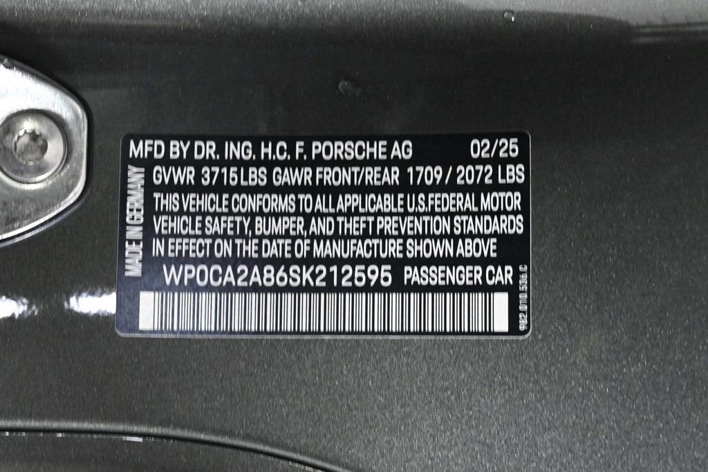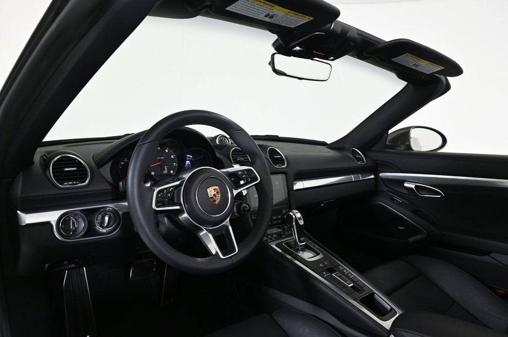 KEY FEATURES AND OPTIONS Comes equipped with: Air Conditioning, MP3, Front Heated Seats. This Porsche 718 Boxster also includes Power Driver's Seat, Clock, Climate Control, Power Passenger Seat, Tachometer, Multi-Zone Climate Control, Memory Seat Position, Cruise Control, Homelink System, Power Steering, Telescoping Steering Wheel, Power Windows, Power Mirrors, Leather Steering Wheel, Driver Airbag, Passenger Airbag, Intermittent Wipers, Side Airbags, Keyless Entry, Rear Defogger, Security System, AM/FM, Rear Spoiler, Sport Seats, Center Arm Rest, Cup Holders, Vanity Mirrors, Heated Mirrors, Daytime Running Lights, Parking Sensors, Reverse Camera, Side Curtain Airbags, Roll Stability Control, Adaptive headlights, Tire Pressure Monitor, Premium Sound, Carpeted Floor Mats, Onboard Hard Drive. Air Conditioning, Climate Control, Dual Zone Climate Control, Cruise Control, Power Steering, Power Windows, Power Mirrors, Leather Steering Wheel, Leather Shifter, Power Drivers Seat, Power Passenger Seat, Memory Seat Position, Clock, Tachometer, Digital Info Center, Homelink System, Tilt Steering Wheel, Telescoping Steering Wheel, Driver Airbag, Passenger Airbag, Side Airbags, Keyless Entry, Security System, ABS Brakes, Traction Control, Dynamic Stability, Rear Defogger, Intermittent Wipers, AM/FM, Leather Interior Surface, , Light Design Package, Premium Package, Sound Package Plus with 6 Loudspeakers, Sport Chrono Package, SportDesign Package in High Gloss Black, 6 Speakers, Radio data system, Automatic temperature control, Porsche Communication Management, Power driver seat, Four wheel independent suspension, 4-Wheel Disc Brakes, Dual front impact airbags, Dual front side impact airbags, Front anti-roll bar, Integrated roll-over protection, Knee airbag, Low tire pressure warning, Occupant sensing airbag, Overhead airbag, Porsche Entry & Drive, Rear anti-roll bar, Brake assist, Exterior Parking Camera Rear, Delay-off headlights, Fully automatic headlights, Headlight cleaning, High intensity discharge headlights: Bi-Xenon, Auto-dimming door mirrors, Bumpers: body-color, Convertible roof wind blocker, Deletion of Model Designation on Rear, Exclusive Design Fuel Cap, Headlight Cleaning Sys Covers in Exterior Color, Heated door mirrors, Model Designation on Rear Painted, Power door mirrors, Power Folding Exterior Mirrors with Courtesy Lighting, Spoiler, Apple CarPlay, Auto-dimming Rear-View mirror, Convertible roof lining, Driver door bin, Driver vanity mirror, Front reading lights, Heated Multifunction Steering Wheel, Illuminated Door-Sill Guards in Carbon Fiber, Illuminated entry, Lane Change Assist (LCA), Luggage Net in Passenger Footwell, Outside temperature display, Passenger vanity mirror, PDK Gear Selector in Aluminum, Pedals & Footrest in Aluminum, Power convertible roof, Sport steering wheel, Telescoping steering wheel, Front Center Armrest, Heated front seats, Sport Plus Seats, Standard Leather Seat Trim, Ventilated Seats, 16.9 Gallon Extended Range Fuel Tank, Passenger door bin, 20 Carrera S Wheels, Wheels Painted in High Gloss Black, Glass rear window, Rain sensing wipers, Recent Oil Change, PORSCHE COMPANY EXECUTIVE CAR, NEVER TITLED / LOW MILES, NICELY EQUIPPED WITH MANY PORSCHE FACTORY ORDERED OPTIONS, INCLUDES DEALER INSTALLED FULL FRONT PAINT PROTECTION FILM. Adaptive headlights, Carpeted Floor Mats, Center Arm Rest, Cup Holders, Daytime Running Lights, Front Heated Seats, Heated Mirrors, HID Headlamps, Navigation System, Parking Sensors, Premium Sound, Rear Spoiler, Rear Spoiler, Reverse Camera, Roll Stability Control, Side Curtain Airbags, Sport Seats, Tire Pressure Monitor, Vanity Mirrors - Contact Alvaro Uribe at 786-628-7606 or auribe@ferrariofmiami.com for more information. -
