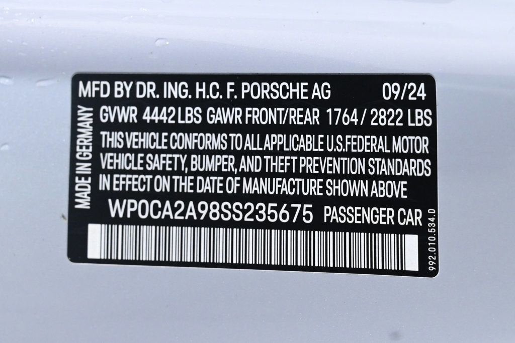 Recent Arrival! Ice Grey Metallic 2025 Porsche 911 Carrera RWD 8-Speed Porsche Doppelkupplung (PDK) 3.0L H6 Turbocharged DOHC 24V LEV3-ULEV70 388hp Recent Oil Change, 360 Camera, Active Parking Assist, Adaptive Cruise Control, Adaptive Headlights, AndroidTM Auto/Apple Carplay, Automatic Headlights, Backup Camera, Blind-Spot Monitors, Bluetooth, Heated/Cooled Seats, Lane Keeping Assist, Navigation, Touchscreen Controls, Voice Recognition, Wi-Fi Hotspot, FRESHLY SERVICED @ THE COLLECTION PORSCHE, NICELY EQUIPPED WITH MANY PORSCHE FACTORY ORDERED OPTIONS., CLEAN CAR FAX VEHICLE HISTORY REPORT., 14-Way Power Sport Seats with Memory Package, Adaptive Cruise Control, BOSE Surround Sound System, Front Ventilated Seats, Ionizer, Lane Change Assist (LCA), Porsche Crest on Front Headrests, Premium Package, Sport Chrono Package, Sport Exhaust System with Tailpipes in Black, SportDesign Package, Storage Net in Passenger Footwell, Surround View with Active Parking Support, Wheels: 20 Front/21 Rear RS Spyder. Difference From the moment you drive into our one-of-a-kind facility, you will feel a difference in the energy here. Simply put: we are not your ordinary car dealership. What truly differentiates us is the professional level of service we provide. When you acquire a new or pre-owned automobile from us, both you and your automobile are treated with the utmost care and attentiveness like a member of our own family. That is why so many of our clients return to THE COLLECTION time and again, and refer us time and time again. We have also amassed an extraordinary team of employees. Plus, we have created all-new positions with your needs in mind. Including a Client Delight Manager which oversees our concierge team and whose sole purpose is to surprise and delight our guests; and on-staff technologists available to assist and educate you on all the latest features available on your vehicle. THE COLLECTION family will exceed your expectations, making this an uniquely gratifying experience that you will want to revisit time and time again. CARFAX One-Owner. Odometer is 1973 miles below market average! Air Conditioning, Climate Control, Dual Zone Climate Control, Cruise Control, Power Steering, Power Windows, Power Mirrors, Leather Steering Wheel, Leather Shifter, Power Drivers Seat, Power Passenger Seat, Clock, Tachometer, Digital Info Center, Homelink System, Tilt Steering Wheel, Telescoping Steering Wheel, Steering Wheel Radio Controls, Driver Airbag, Passenger Airbag, Side Airbags, Keyless Entry, Security System, ABS Brakes, Traction Control, Dynamic Stability, Rear Defogger, Fog Lights, Intermittent Wipers, AM/FM, Alloy Wheels, Leather Interior Surface, Navigation system: Porsche Communication Management (PCM), Sound Package Plus, 8 Speakers, Radio data system, Automatic temperature control, Porsche Communication Management, Power driver seat, Adaptive suspension, Four wheel independent suspension, 4-Wheel Disc Brakes, Dual front impact airbags, Dual front side impact airbags, Emergency communication system, Front anti-roll bar, Integrated roll-over protection, Low tire pressure warning, Occupant sensing airbag, Overhead airbag, Rear anti-roll bar, Brake assist, Exterior Parking Camera Rear, Delay-off headlights, Fully automatic headlights, Auto-dimming door mirrors, Bumpers: body-color, Convertible roof wind blocker, Heated door mirrors, Power door mirrors, Spoiler, 4-Way Sport Seats, Auto-dimming Rear-View mirror, Convertible roof lining, Driver door bin, Driver vanity mirror, Front reading lights, Heated steering wheel, Illuminated entry, Outside temperature display, Overhead console, Passenger vanity mirror, Power convertible roof, Sport steering wheel, Telescoping steering wheel, Front Center Armrest, Heated front seats, Leather Seat Trim, Sport Plus Seats, Passenger door bin, Wheels: 19 Front/20 Rear Carrera, Glass rear window, Rain sensing wipers Aux. Audio Input, Carpeted Floor Mats, Center Arm Rest, Cup Holders, Daytime Running Lights, Front Heated Seats, Heated Mirrors, Overhead Console, Parking Sensors, PCM, Rear Fog Lamps, Rear Spoiler, Rear Spoiler, Reverse Camera, Roll Stability Control, Side Curtain Airbags, Sliding Rear Window, Sport Seats, Tire Pressure Monitor, Vanity Mirrors - Contact Alvaro Uribe at 786-628-7606 or auribe@ferrariofmiami.com for more information. -