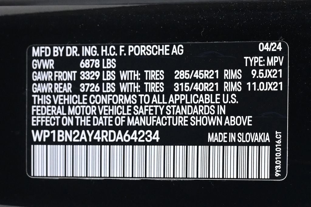 - Limited Warranty: 24 Month/Unlimited Mile beginning after new car warranty expires or from certified purchase date Air Conditioning, Climate Control, Dual Zone Climate Control, Cruise Control, Tinted Windows, Power Steering, Power Windows, Power Mirrors, Leather Steering Wheel, Leather Shifter, Power Passenger Seat, Memory Seat Position, Phone, Clock, Tachometer, Digital Info Center, Homelink System, Tilt Steering Wheel, Telescoping Steering Wheel, Steering Wheel Radio Controls, Sunroof, Moonroof, Driver Airbag, Passenger Airbag, Keyless Entry, Security System, ABS Brakes, Traction Control, Dynamic Stability, Rear Defogger, Fog Lights, Intermittent Wipers, AM/FM, Alloy Wheels, Leather Interior Surface, Navigation System, Technology Package, 10 Speakers, Audio memory, Radio data system, Air Quality System, Automatic temperature control, HVAC memory, Head-Up Display, Porsche Communication Management, Power driver seat, Adaptive suspension, Auto-leveling suspension, Four wheel independent suspension, 4-Wheel Disc Brakes, Brake Calipers in High Gloss Black, Dual front impact airbags, Dual front side impact airbags, Front anti-roll bar, Knee airbag, Low tire pressure warning, Occupant sensing airbag, Overhead airbag, Rear anti-roll bar, Rear side impact airbag, Power Liftgate, Brake assist, Exterior Parking Camera Rear, Auto High-beam Headlights, Delay-off headlights, Fully automatic headlights, Thermally & Noise Insulated Front & Rear Glass, Auto-dimming door mirrors, Bumpers: body-color, HD-Matrix Design LED Headlights, Heated door mirrors, Power door mirrors, Spoiler, Sports Tailpipes in Dark Bronze, Turn signal indicator mirrors, 18-Way Adaptive Front Sport Seats with Comfort Memory, Auto-dimming Rear-View mirror, Compass, Driver door bin, Driver vanity mirror, Fire Extinguisher, Front reading lights, Illuminated Brushed Aluminum Door-Sill Guards, Illuminated entry, Interior Trim in Deep Brushed Aluminum, Night Vision Assist, Outside temperature display, Overhead console, Passenger Display, Passenger vanity mirror, Rear reading lights, Rear seat center armrest, Surround View, Telescoping steering wheel, Voltmeter, Front Center Armrest, Front Ventilated Seats, Heated front seats, Leather Seat Trim with Standard Interior, Rear Comfort Seats (2 + 1), Split folding rear seat, Sport Plus Seats, Passenger door bin, Trailer Hitch with o Tow Ball, Wheels: 21 RS Spyder Design in Chromite Black Met, Power Sunblind for Rear Side Windows, Rain sensing wipers, Axle Ratio: TBD, New Tires, Recent Oil Change, Passed Inspection, 360 Camera, Active Parking Assist, Automatic Headlights, Backup Camera, Bluetooth, Heated/Cooled Seats, Navigation, Touchscreen Controls, Voice Recognition, Wi-Fi Hotspot, SOLD NEW & FRESHLY SERVICED @ THE COLLECTION PORSCHE, CLEAN CAR FAX VEHICLE HISTORY REPORT Adaptive headlights, Aux. Audio Input, Bluetooth, Carpeted Floor Mats, Center Arm Rest, Child Proof Door Locks, Daytime Running Lights, Front Heated Seats, Heated Mirrors, Navigation System, Overhead Console, Parking Sensors, PCM, Power Lift Gate, Rear Fog Lamps, Rear Spoiler, Rear Spoiler, Rear-Side Airbags, Remote Fuel Door, Reverse Camera, Roll Stability Control, Side Curtain Airbags, Sliding Rear Window, Sport Seats, Tire Pressure Monitor, Vanity Mirrors - Contact Alvaro Uribe at 786-628-7606 or auribe@ferrariofmiami.com for more information. -