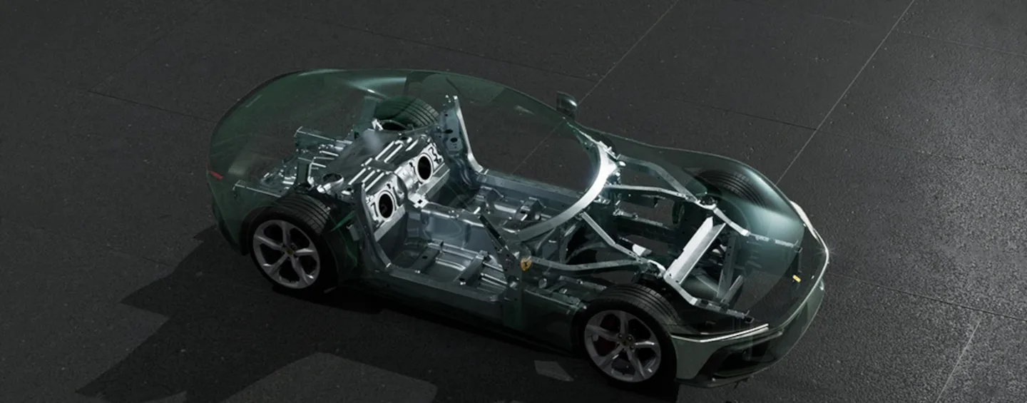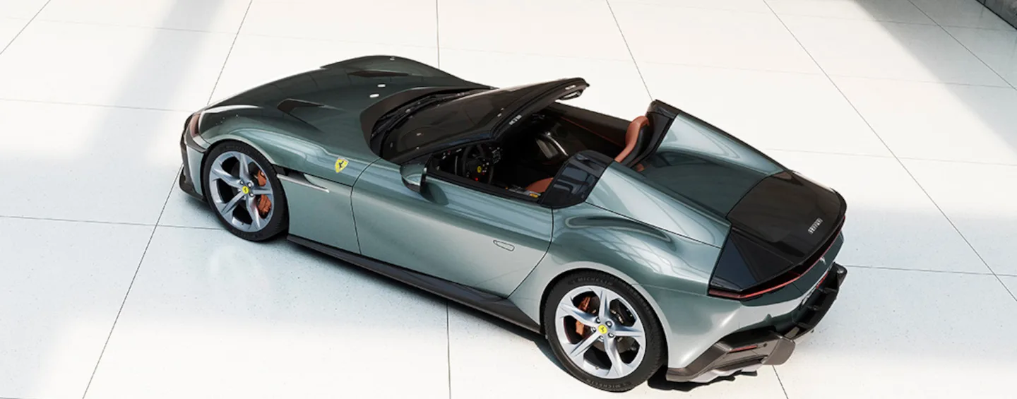 This car differs from the Ferrari 12Cilindri in the boldly expressive character created by the two buttresses at the rear, behind which an element with a black-screen effect is set. The crease lines evident on the buttresses clearly echo the motif of the flank, accentuating the expressiveness of the design of these elements. Set into the flank is a ‘quarterlight’ in back-painted polycarbonate. 12Cilindri Spider is stunningly beautiful, and with the top open immerses the driver into the world around them for maximum driving pleasure.